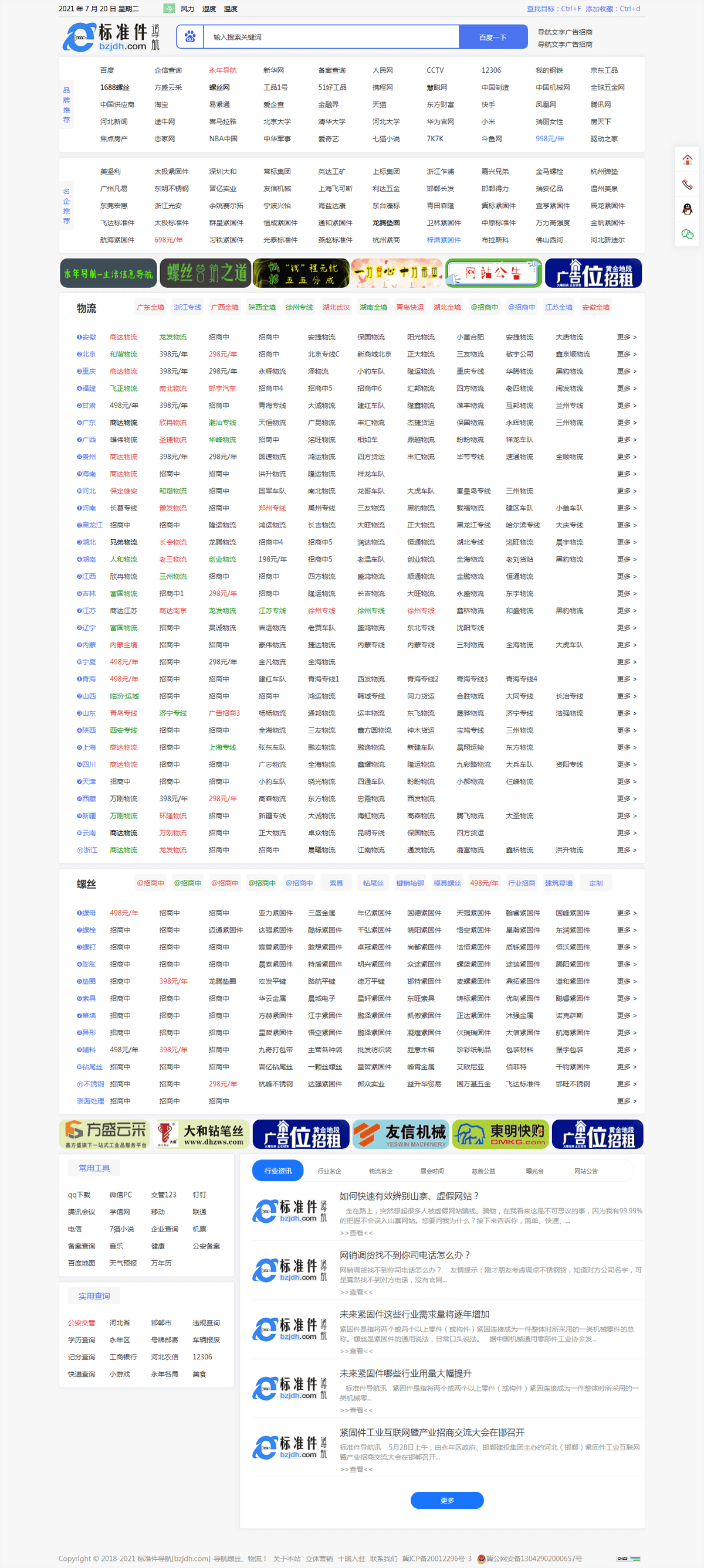 标准件导航网站提供螺丝、物流等行业信息。让您一个网站,一个网页了解螺母、螺栓、钻尾丝等紧固件,还有广东、江苏、浙江、山东各省市物流信息。我们承诺:发现失信、骗人、黑心、无德商家立刻下掉其网站信息,并且把剩余广告费补偿损失商家,同时协助挽回损失。